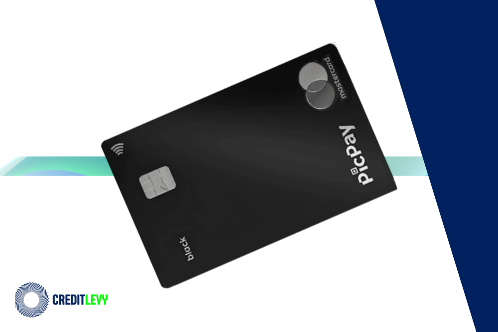Cartão Pic Pay Black com chip, pagamento por aproximação e bandeira Mastercard, exibido em fundo branco e azul com logo da Credit Levy.